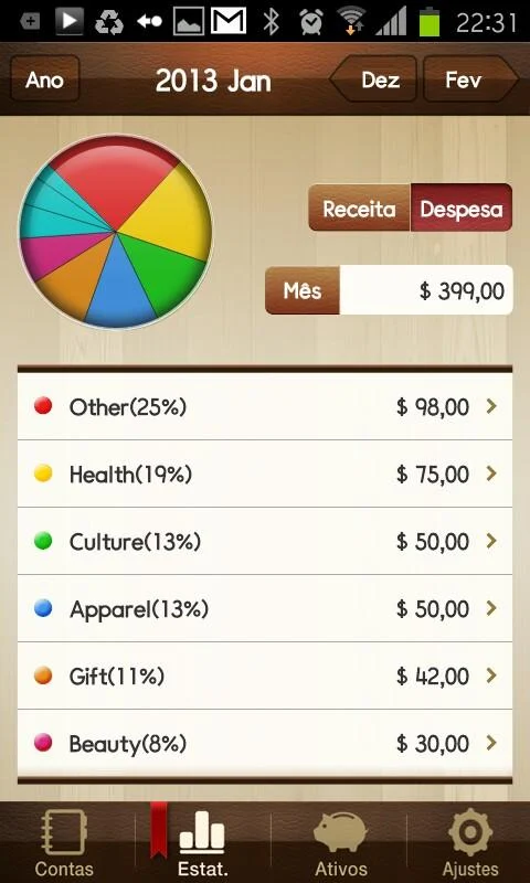 O Money Manager tem um layout usável e com algumas propagandas, possui diversos modos de visualização das receitas e despesas (dia - semana - mês), tem gráficos e estatísticas, além de permitir a adição de várias carteiras na aba Ativos.