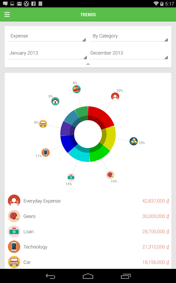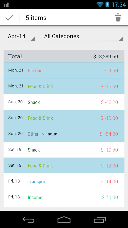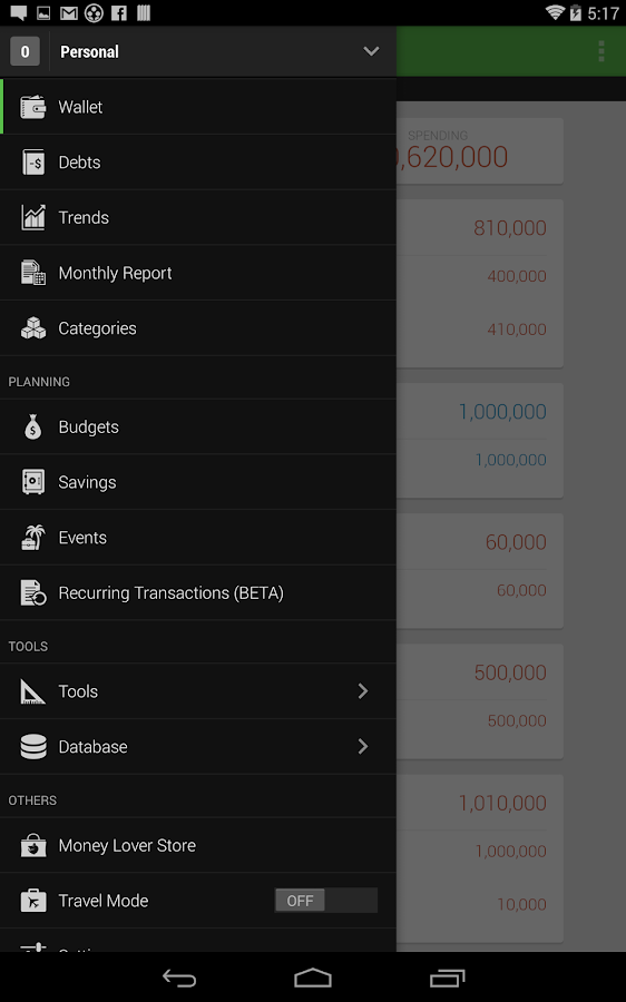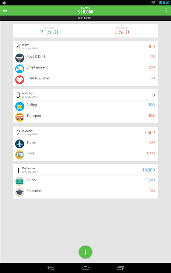 O Money Lover para mim é o app mais completo que já testei. Ele tem um layout clean e bonito (um layout legal muda completamente a minha experiência com o app), mas tem propaganda (que podem ser removidas por R$4,44. Permite colocar esquema de segurança (ligue os pontos), mas não tem o idioma português do Brasil. Possui vários modos de visualização das receitas e despesas (mais até que o Money Manager), podendo até realizar pesquisa por um determinada transação.
